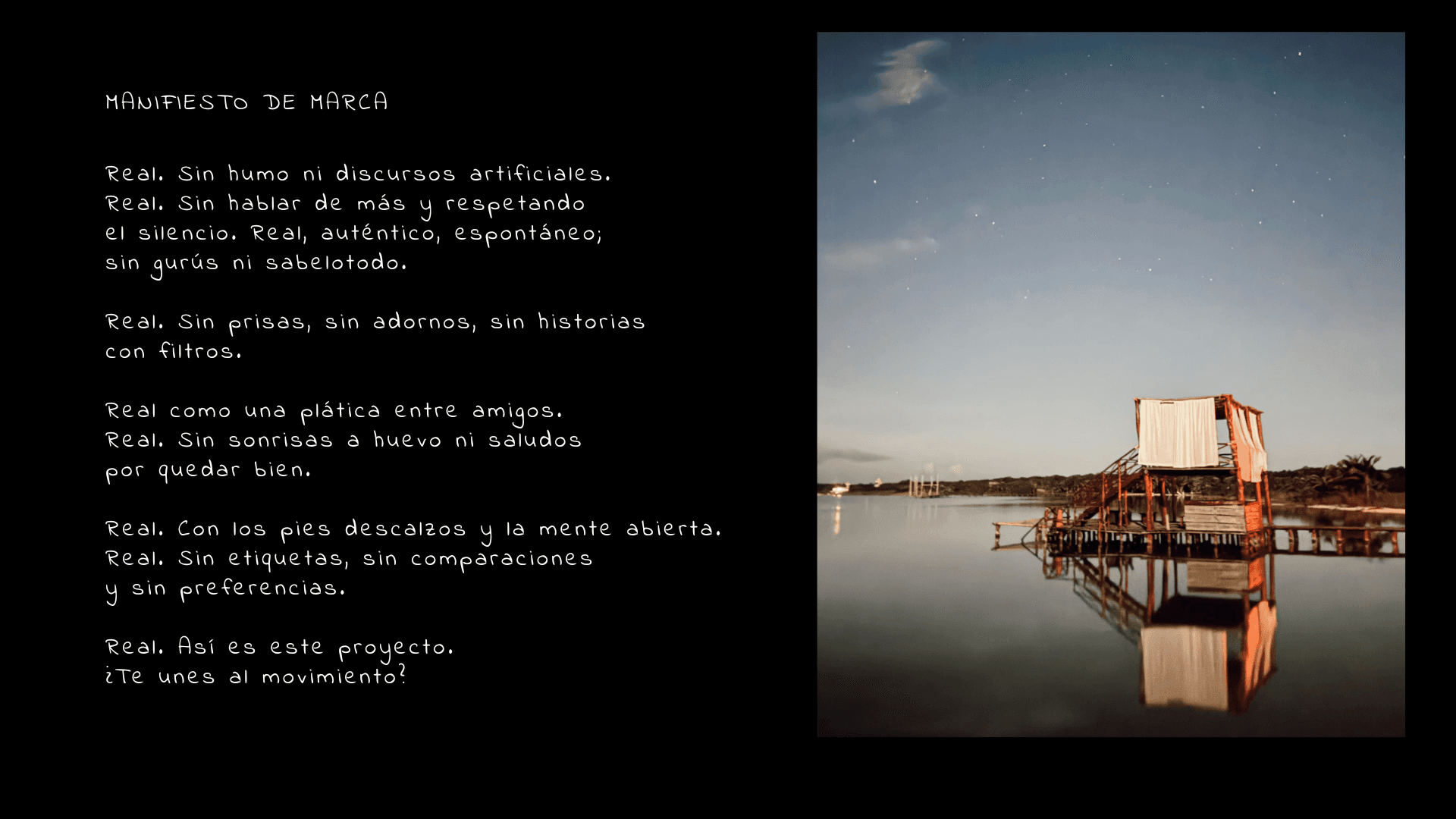 I developed the full creative concept, brand manifesto, and visual identity for REAL, an event series for the Real Estate industry. Moving away from artificial speeches and "gurus," I built a brand rooted in rawness, simplicity, and emotional depth.Identity, Naming, and Manifesto: I designed the logo starting from hand-drawn lettering, ensuring the visual core of the brand felt as authentic and human as its message.The Flagship Event: Held at the Nopalitos Lagoon, the event featured a curated lineup of speakers, including Roberto Martínez (host of Podcast Creativo).